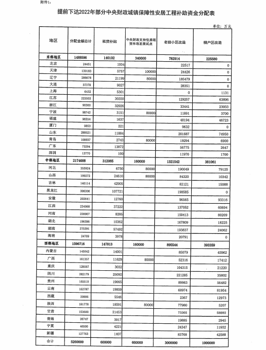 提前下达2022年部分中央财政城镇保障性安居工程补助资金预算