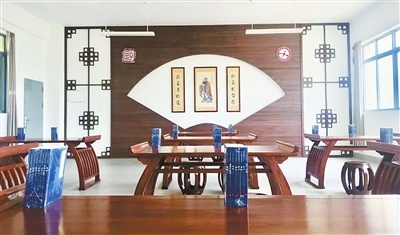 记者发现,该馆内的硬件设施已基本配置齐全。数张木质的绛色桌椅整齐地摆放在厅堂之内,书桌上还放置有《论语》《大学》《孟子》等中国传统文学读本,营造出浓厚的古典文化学习氛围。